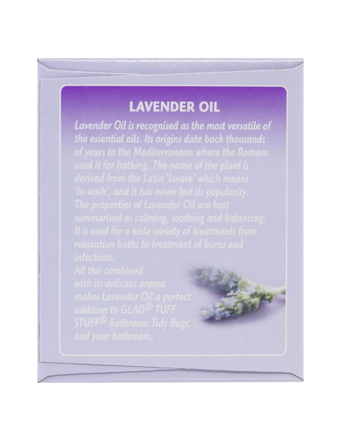 Glad® Tuff Stuff® Bathroom Bags are made with the Glad® trusted strength and quality, making them perfect for disposing of rubbish in the bathroom. These bags also have the addition of Lavender Oil for a delicate, soothing aroma. When they're full, the secure drawstring closure makes them easy to tie up and carry out.