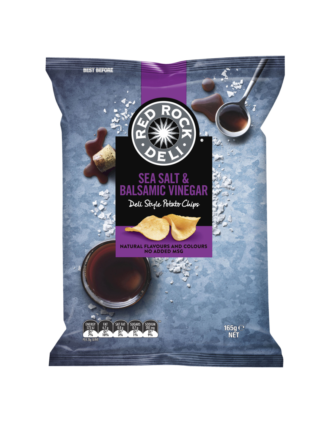 Red Rock Deli Potato Chips Sea Salt & Balsamic Vinegar flavoured potato chips are seasoned with a fresh grinding of sea salt, combined with sweet aged balsamic vinegar. Our fascination for flavour begins with the finest Australian potatoes. Roughly cut and slow-cooked in 100% Sunflower Oil, they're then seasoned with delicious ingredients using inspiring recipes prepared by passionate foodies, for a truly unique taste sensation. Our chips contain natural colours with no added MSG.
