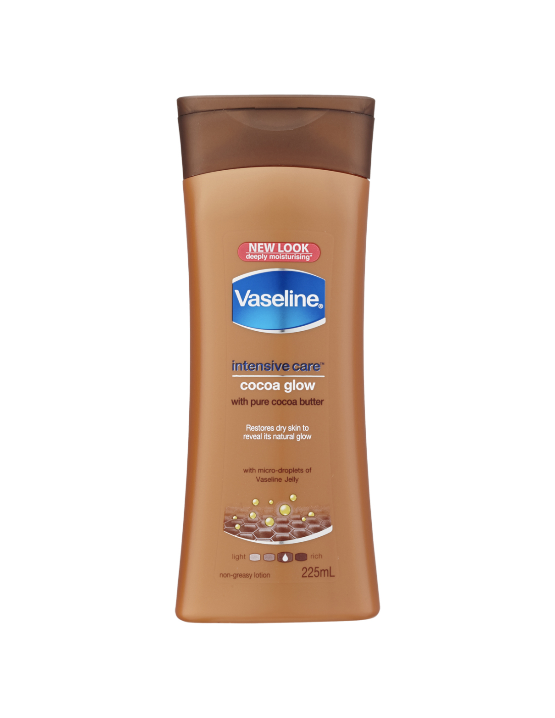 Vaseline Intensive Care Body Lotion Cocoa Glow 225ml, restores the appearance of dry skin to reveal its natural glow. With pure cocoa butter, it moisturises to restore the look of dry and dull-looking skin and absorbs fast for a non-greasy feel. In our Intensive Care™ Cocoa Glow Lotion, we’ve combined micro-droplets of Vaseline® Jelly, powerful moisturisers, and pure cocoa butter, in a rich, fast-absorbing formula. The result is a lotion that moisturises to restore the appearance of dry and dull-looking skin, bringing out its natural glow. Vaseline® Petroleum Jelly is the original wonder jelly. Vaseline has long been used to manage symptoms of many severe skin conditions. It literally melts into the skin, flowing into the tiny cracks caused by dryness where moisture is needed most. In this way Vaseline acts as an extremely powerful skin moisturiser to provide a barrier against water loss from already dry skin and help protect against the effects of weather and exposure. Our petroleum jelly is triple-purified to be 100% pure. Vaseline® believes that truly healthy skin starts with deep moisture. It’s not something you get by masking problems or through quick fixes. We know this because we are the original skin experts. Founded in 1870 by Robert Chesebrough, Vaseline® has been safely helping care for skin for over 140 years.