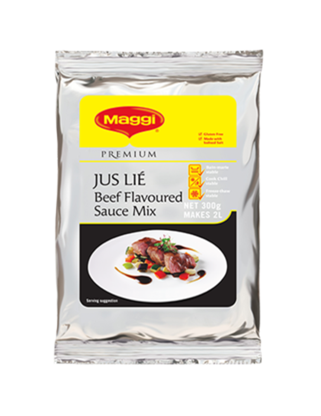 MAGGI® PREMIUM Jus Lie̒ Beef Flavoured Sauce Mix (300g x 4) Maggi Premium Jus Lie Beef Flavoured Sauce Mix provides juicy roasted meat, tomato and red wine flavours to create a well balanced, rich tradtional tasting jus.