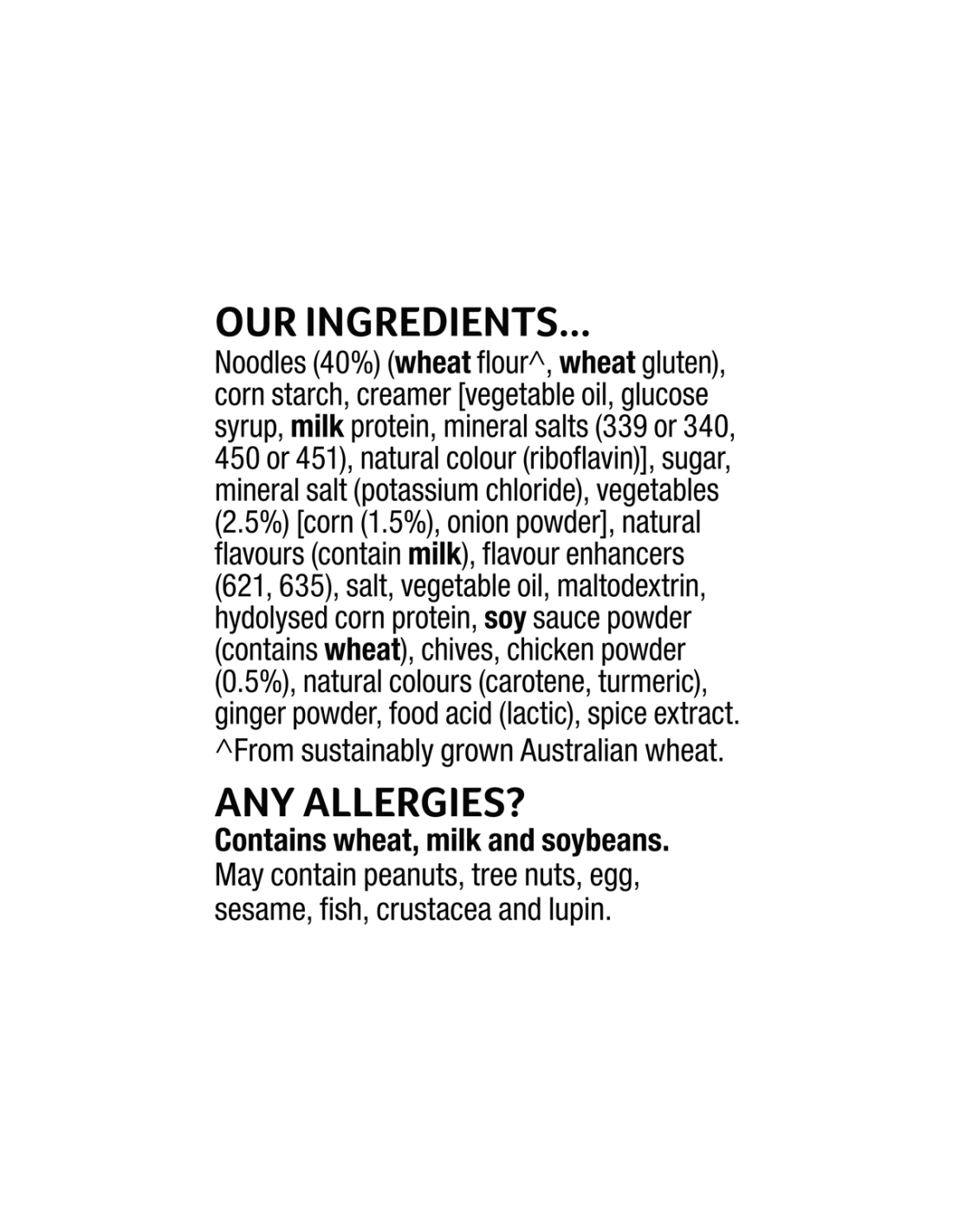 Our ingredients...Noodles (40%) (wheat flour^, wheat gluten), corn starch, creamer [vegetable oil, glucose syrup, milk protein, mineral salts (339 or 340, 450 or 451), natural colour (riboflavin)], sugar, mineral salt (potassium chloride), vegetables (2.5%) [corn (1.5%), onion powder], natural flavours (contain milk), flavour enhancers (621, 635), salt, vegetable oil, maltodextrin, hydolysed corn protein, soy sauce powder (contains wheat), chives, chicken powder (0.5%), natural colours (carotene, turmeric), ginger powder, food acid (lactic), spice extract.^From sustainably grown Australian wheat.