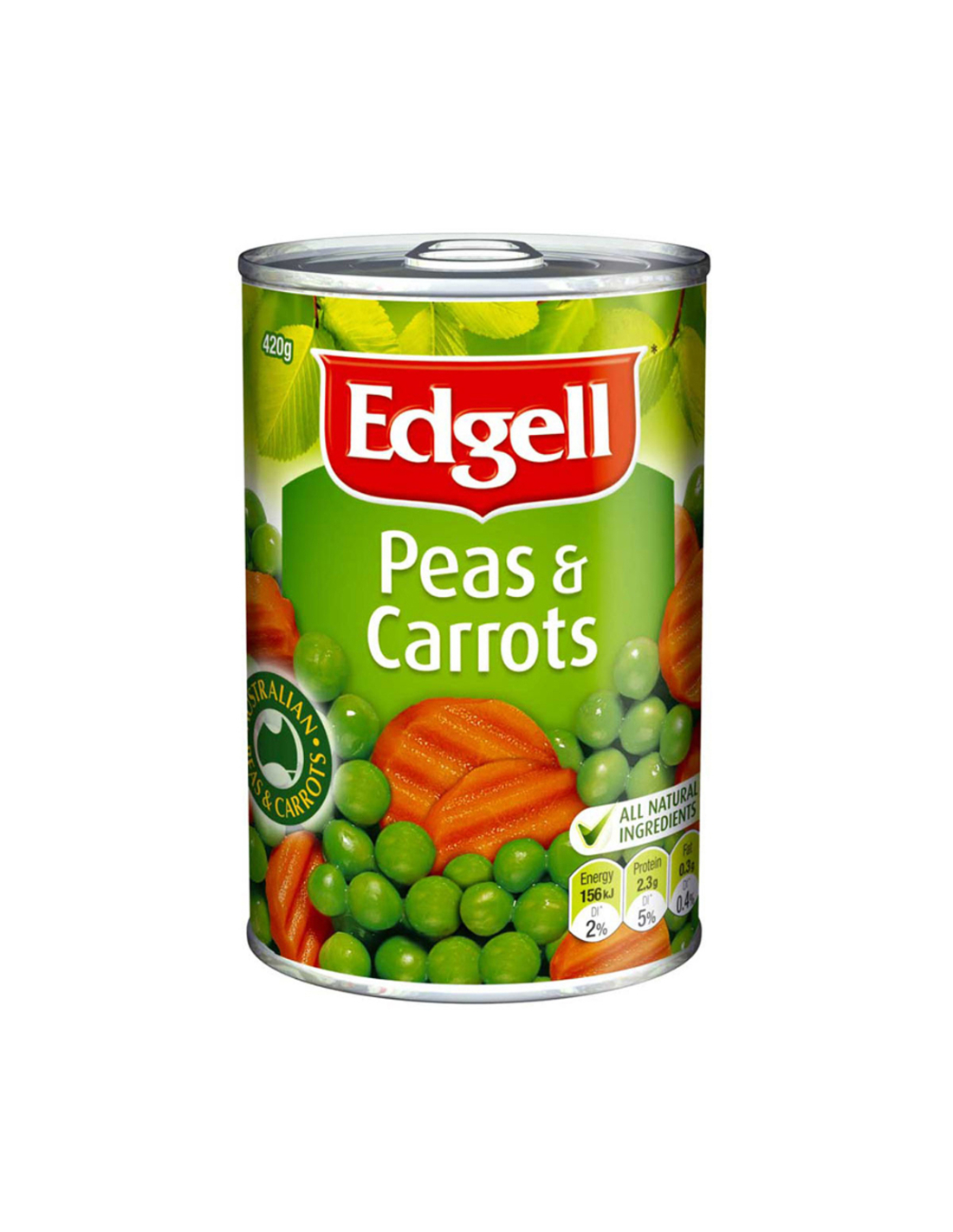 - Green peas and crinkle cut carrots- Naturally low in fat - Great in stir fries and pastas- Australian Grown- Source of FibreGreen peas and crinkle-cut carrots, low in fat and proudly grown in Australia. A quick and easy way to add veg to stir-fries and pastas.Green peas and crinkle-cut carrots, proudly grown in Australia. Whether you're cooking a quick stir-fry or preparing sides for a roast, Edgell Peas and Carrots are ready to enjoy.Edgell Peas and Carrots are a classic vegetable mix perfect for all your favourite recipes. Naturally low in fat, they are also a source of fibre. A great addition to soups and casseroles, or enjoyed as a side dish to roast meats.