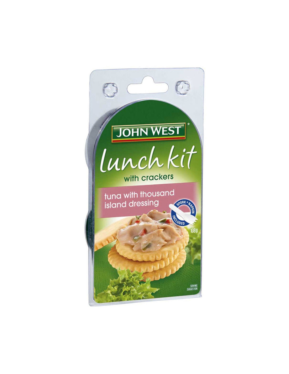 Lunch kit contains tuna with Thousand Island dressing, crackers and a spork.