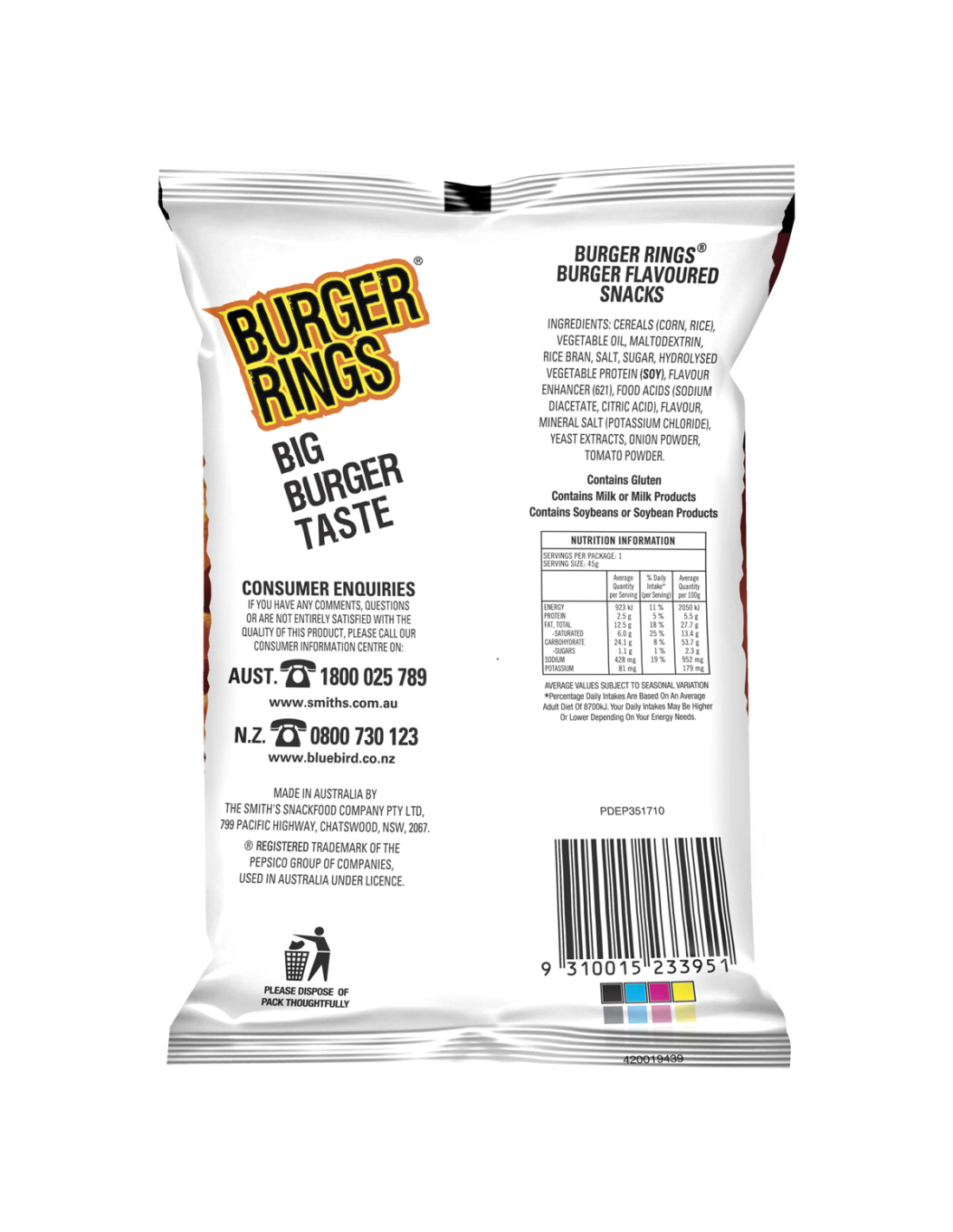 Una deliciosa barreja de tomàquet, formatge i barbacoa que és prou tan tangy com per colpejar el lloc, però no tan intensament per esdevenir aclaparadora. Burger Rings® té un sabor d'hamburgueses únic que cap altra marca d'aperitius pot coincidir!