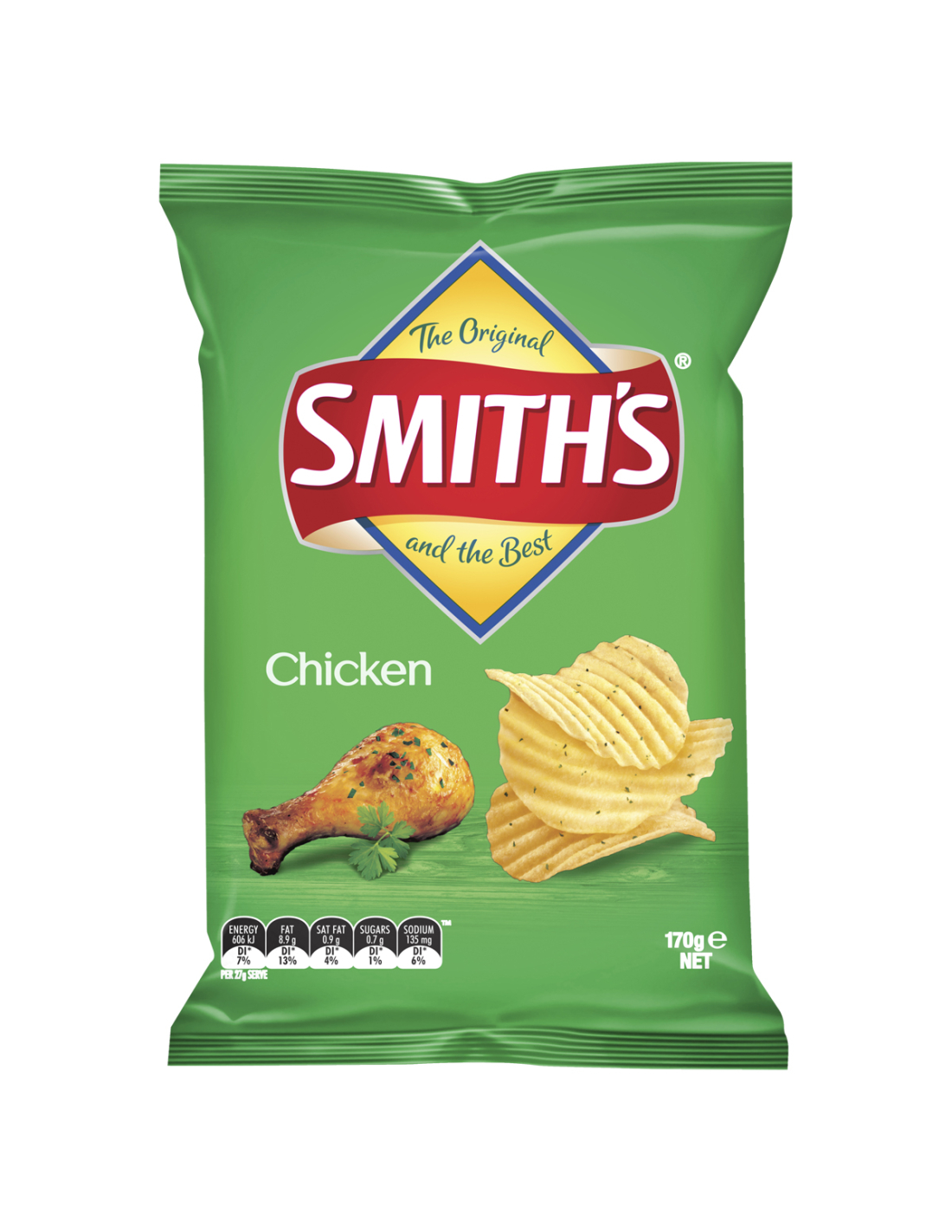 Smith's Crinkle Cut Chicken Potato Chips - There is no better snack when watching the footy grand final, having a picnic or indulging after work. Our top quality Aussie potatoes are peeled & sliced to just the right crinkle cut thickness & cooked to perfection then sprinkled with our famous seasoning so you can enjoy the classic crunch & unbeatable Chicken flavour that only a Smith's potato chip can bring!