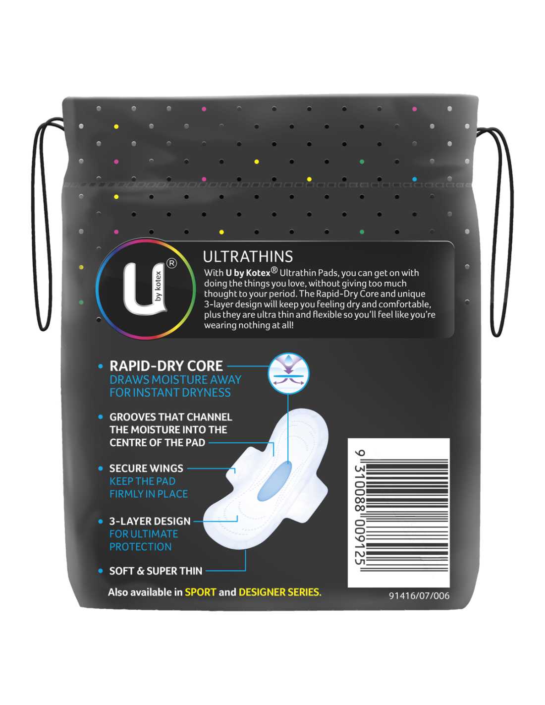 Amb U By Kotex® PADS ULTRATHIN, podeu continuar fent les coses que us agraden, sense donar massa pensament al vostre període. El nucli ràpid-sec i el disseny únic de 3 capes us mantindrà sentint-vos secs i còmodes, a més de ser ultra prim i flexible, de manera que us sentiràs com ara que no porteu res!