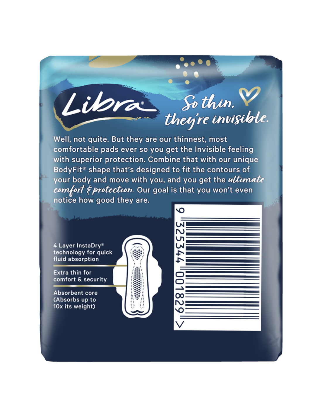 So thin, they're invisible. Well, not quite. But they are our thinnest, most comfortable pads ever so you get the Invisible feeling with superior protection. Combine that with our unique BodyFit® shape that's designed to fit the contours of your body and move with you, and you get the ultimate comfort & protection. Our goal is that you won't even notice how good they are.