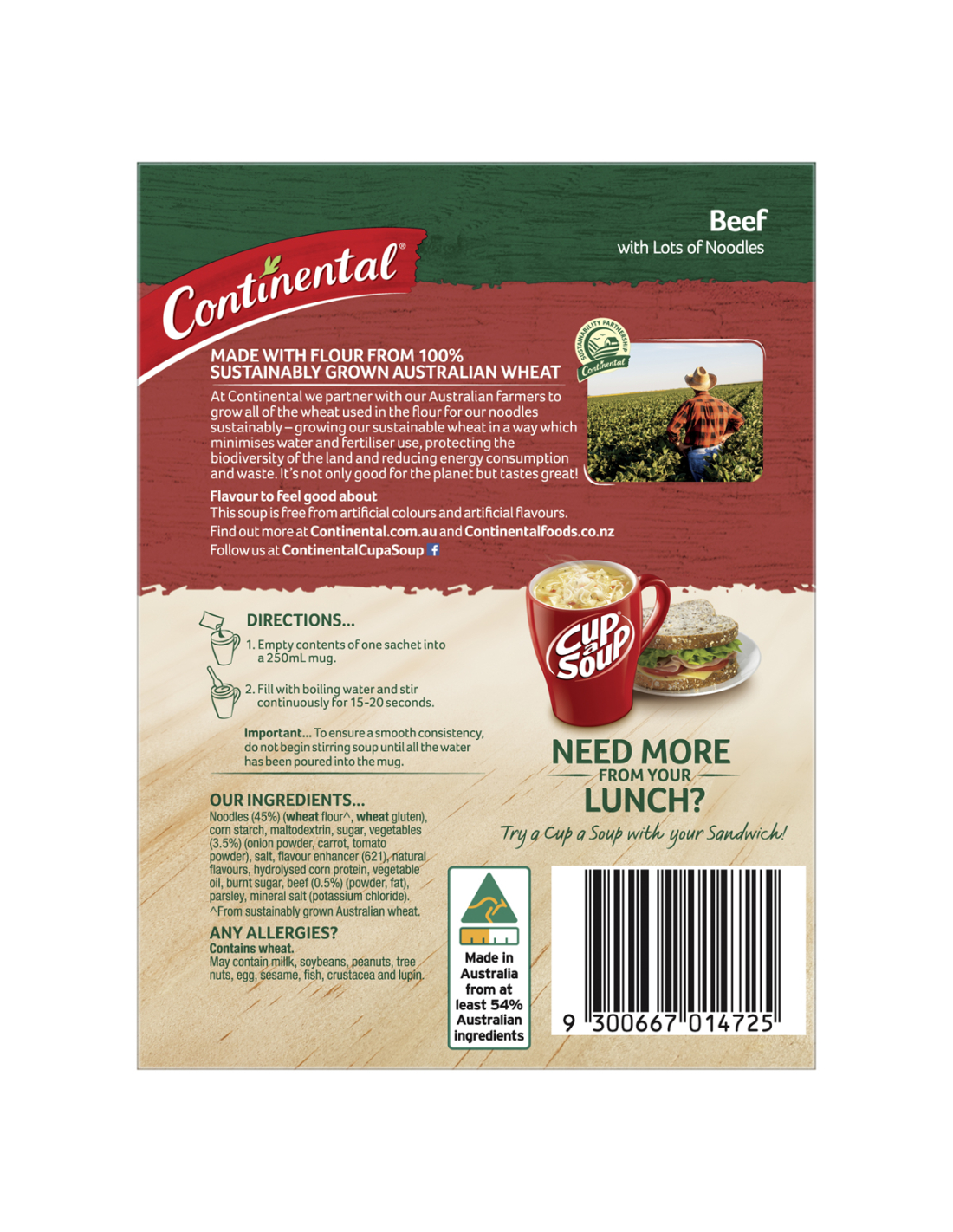 At Continental we partner with our Australian farmers to grow all of the wheat used in the flour for our noodles sustainably - growing our sustainable wheat in a way which minimises water and fertiliser use, protecting the biodiversity of the land and reducing energy consumption and waste. It's not only good for the planet but tastes great! Continental has been a part of Australian homes since the 1950s, when we first launched our iconic Chicken Noodle Soup. Since then, we have been consistently delivering Australians the soups they know and love. Our Continental products are made with carefully selected ingredients. All of our vegetables, herbs and spices are grown in the field, ripened in the sun, and harvested in season – when they taste their best. Next, these ingredients are dried, which is the oldest known way of preserving food. At Continental, we’ve always prided ourselves on the quality of what we produce, from sourcing the best quality ingredients to putting passionate and talented chefs in our kitchens. Now we’re bringing this same passion for quality to our quest for sustainability, because food grown responsibly simply tastes better. This means reducing water consumption to produce our crops and protecting the environment and biodiversity in the areas surrounding our farms. Go to http://continental.com.au/ to find our full range of flavours such as vegetable soup, instant noodles, classic chicken soup, laksa soup, meaty soup, French onion soup, and more quick soup recipes.