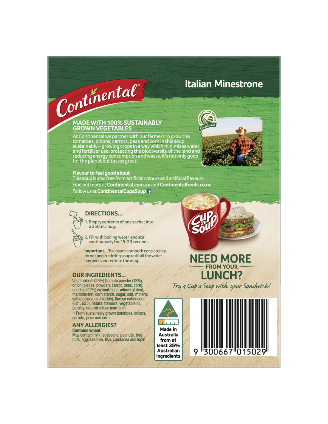 Made with 100% Sustainably Grown Vegetables. At Continental we partner with our farmers to grow the tomatoes, onions, carrots, peas and corn in this soup sustainably – growing crops in a way which minimises water and fertiliser use, protecting the biodiversity of the land and reducing energy consumption and waste. It’s not only good for the planet but tastes great! Continental has been a part of Australian homes since the 1950s, when we first launched our iconic Chicken Noodle Soup. Since then, we have been consistently delivering Australians the soups they know and love. Our Continental products are made with carefully selected ingredients. All of our vegetables, herbs and spices are grown in the field, ripened in the sun, and harvested in season – when they taste their best. Next, these ingredients are dried, which is the oldest known way of preserving food. At Continental, we’ve always prided ourselves on the quality of what we produce, from sourcing the best quality ingredients to putting passionate and talented chefs in our kitchens. Now we’re bringing this same passion for quality to our quest for sustainability, because food grown responsibly simply tastes better. This means reducing water consumption to produce our crops and protecting the environment and biodiversity in the areas surrounding our farms.