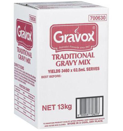 A cost-effective choice in a convenient 3kg bulk pack GRAVOX Gravy Maker Mix is designed for use according to traditional gravy preparation methods. Add meat juices from roasts or pan-frying for best results. Its authentic traditional flavour will complement all meats.