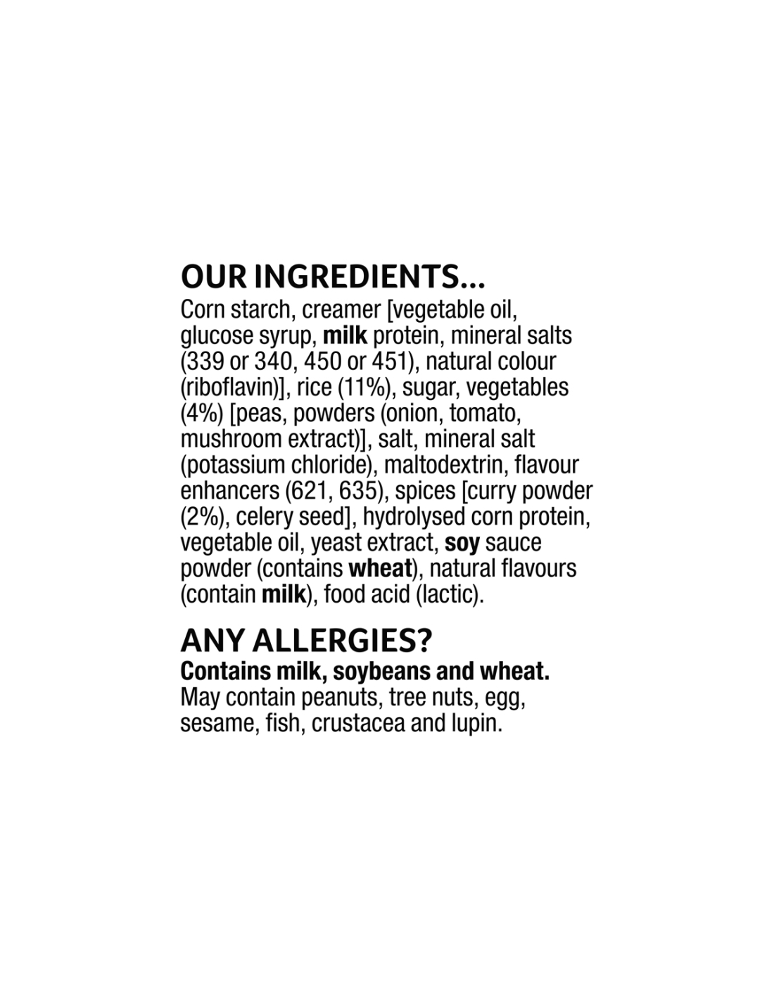 En Continental creamos esta sopa combinando verduras y especias secas de alta calidad para asegurar una gran sopa degustación cada vez. Esta sopa está libre de colores y sabores artificiales. Instrucciones: 1) Contenido vacío de una mancha en una taza de 250 ml. 2) Llenar con agua hirviendo y revolver continuamente durante 15-20 segundos. Importante: Para asegurar una consistencia suave, no comience a remover la sopa hasta que todo el agua haya sido derramada en la taza. Averigüe más Continental.com.au. Continental ha sido parte de las casas australianas desde los años 50, cuando lanzamos por primera vez nuestra emblemática Sopa de Pollo. Desde entonces, hemos estado entregando constantemente a los australianos las sopas que conocen y aman. Nuestros productos Continentales están fabricados con ingredientes cuidadosamente seleccionados. Todas nuestras verduras, hierbas y especias se cultivan en el campo, maduran en el sol, y se cosechan en temporada – cuando saborean lo mejor de ellos. A continuación, estos ingredientes se secan, que es la forma más antigua de preservar los alimentos. En Continental, siempre nos hemos enorgullecido de la calidad de lo que producimos, desde la adquisición de los ingredientes de la mejor calidad para poner chefs apasionados y talentosos en nuestras cocinas. Para recetas, sugerencias y consejos visita www.continental.com.au / www.continentalfoods.co.nz. Preguntas o comentarios? 1800 888 997 Australia, 0800 231 022 Nueva Zelanda. También visite nuestro sitio web para encontrar toda nuestra gama de sabores como sopa vegetal, fideos instantáneos, sopa clásica de pollo, sopa de laksa, sopa de carne, sopa de cebolla francesa y recetas de sopa más rápidas.