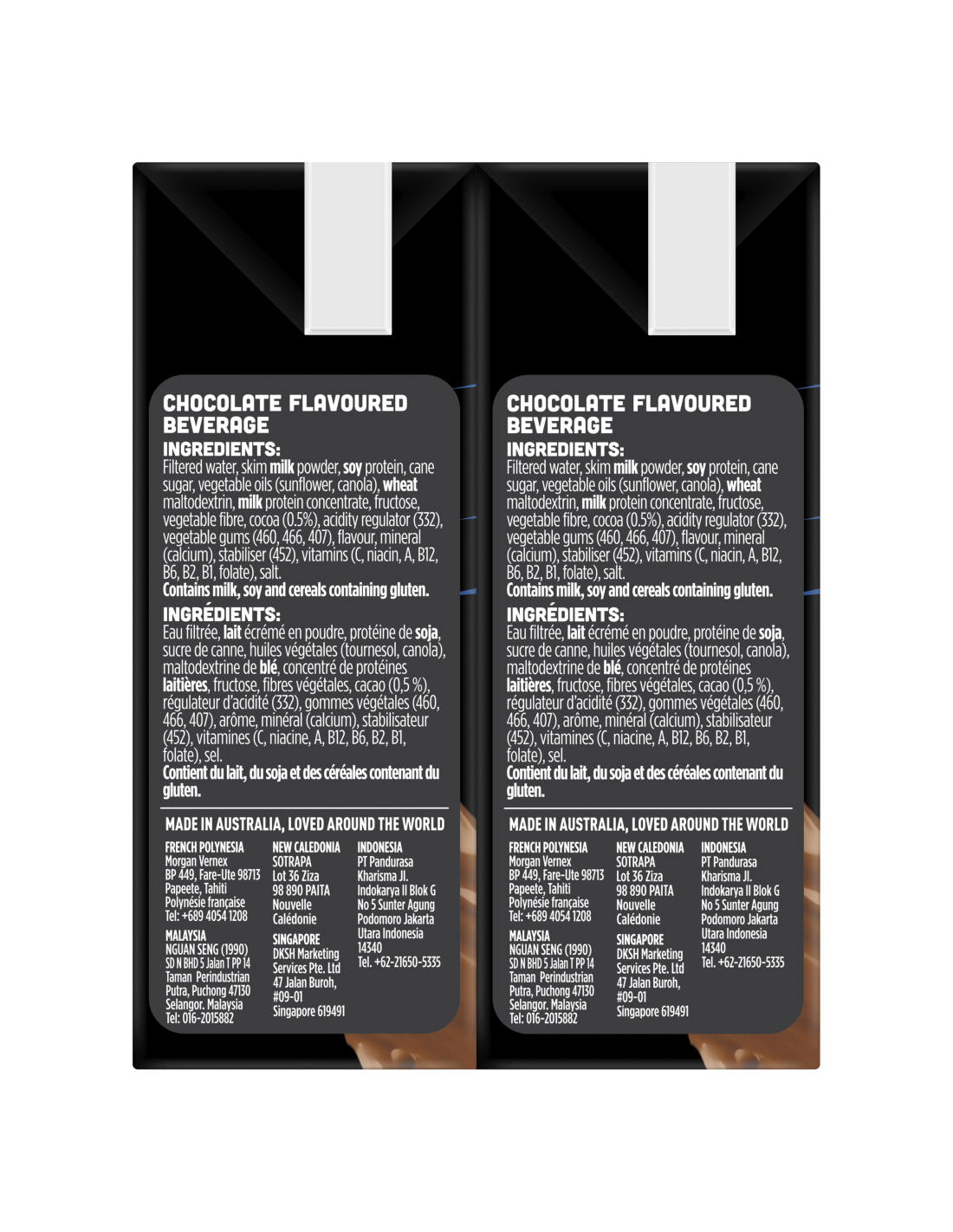 Ingredientes: agua filtrada, leche en polvo de leche, proteína de soja, azúcar de caña, maltodextrina (trigo, maíz), concentrado de proteína de leche, aceites vegetales (girasol, canola), fructosa, cacao (0.5%), vegetal Fibra, regulador de acidez (332), sabor, gomas de vegetales (460, 466, 407), mineral (calcio), estabilizador (452), sal, vitaminas (C, niacina, A, B12, B6, B2, B1, folato).