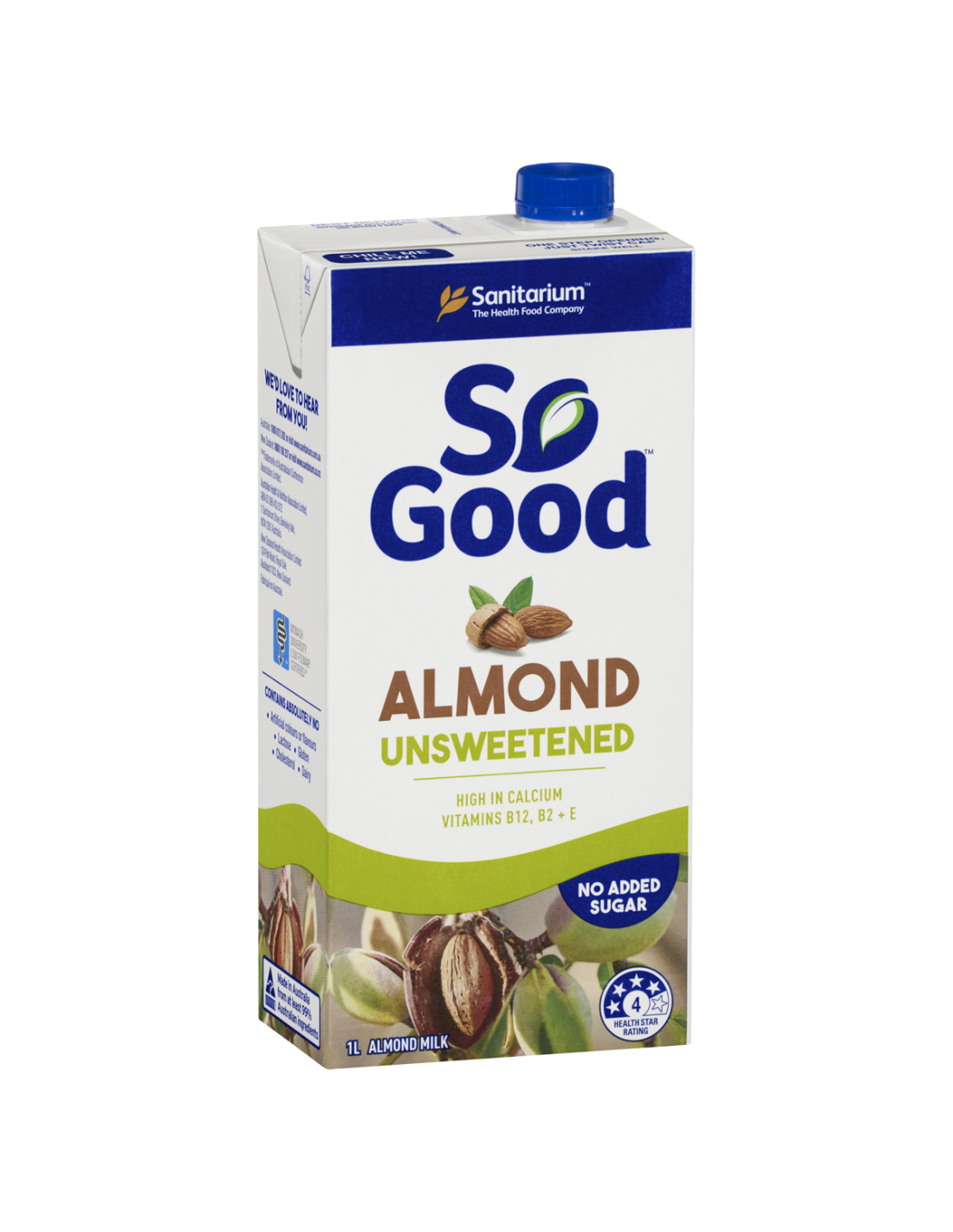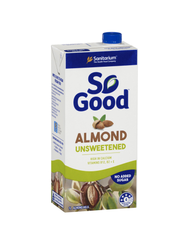 La leche de almendras sin azúcar So Good ™ de larga duración es súper versátil y está repleta de nutrientes como calcio, B2 y B12. Agréguelo a su batido, viértalo en su cereal (¡recomendamos Weet-bix ™!), O úselo en sus recetas favoritas.