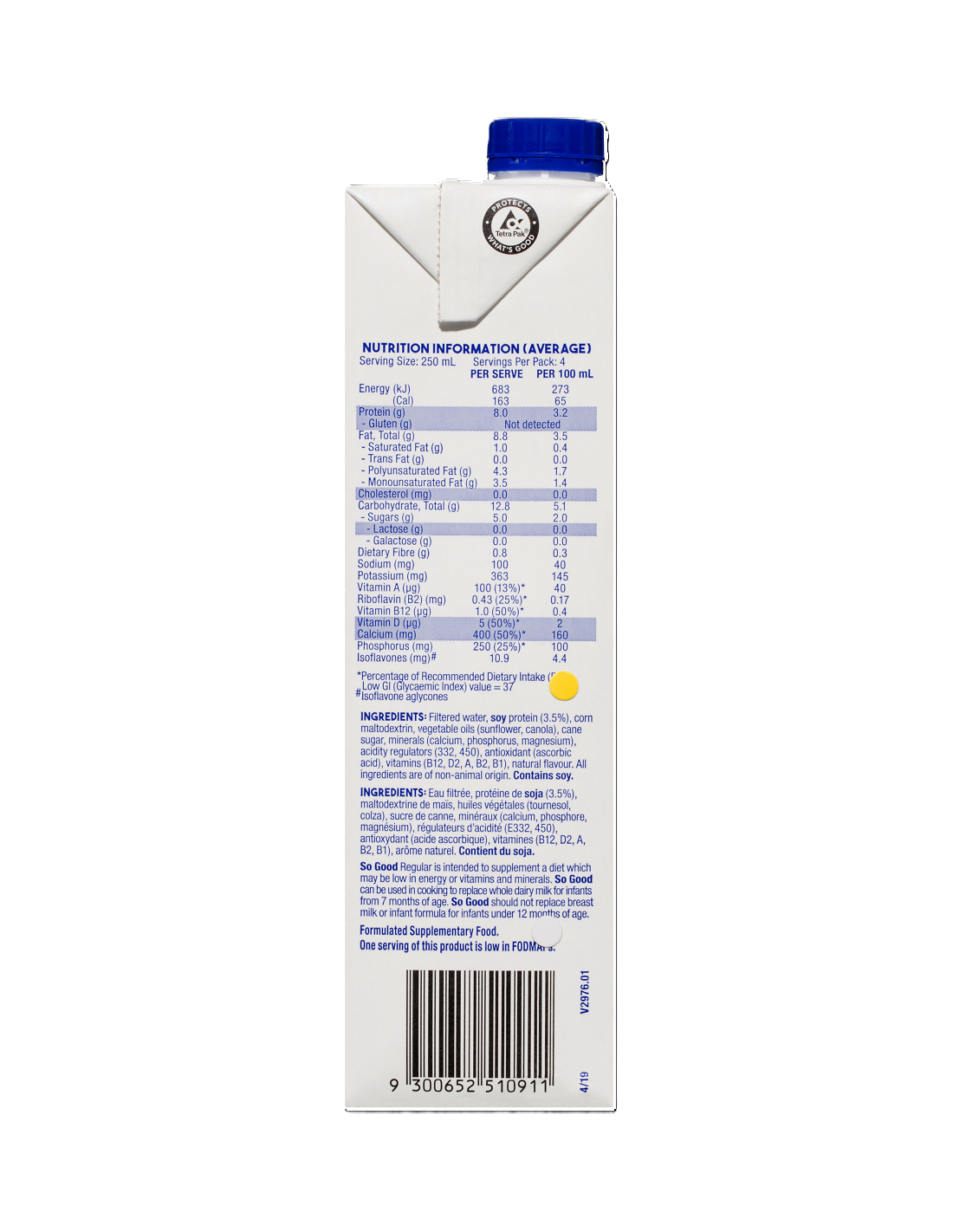 La leche de soya regular So Good ™ es una leche cremosa nutritiva y deliciosa hecha de soya. Con proteínas y minerales esenciales, es naturalmente libre de lactosa y colesterol. Y con el beneficio adicional de la mitad de su calcio y vitamina D diarios en un vaso, So Good ™ Regular puede ser la leche para su cuerpo y su vida.