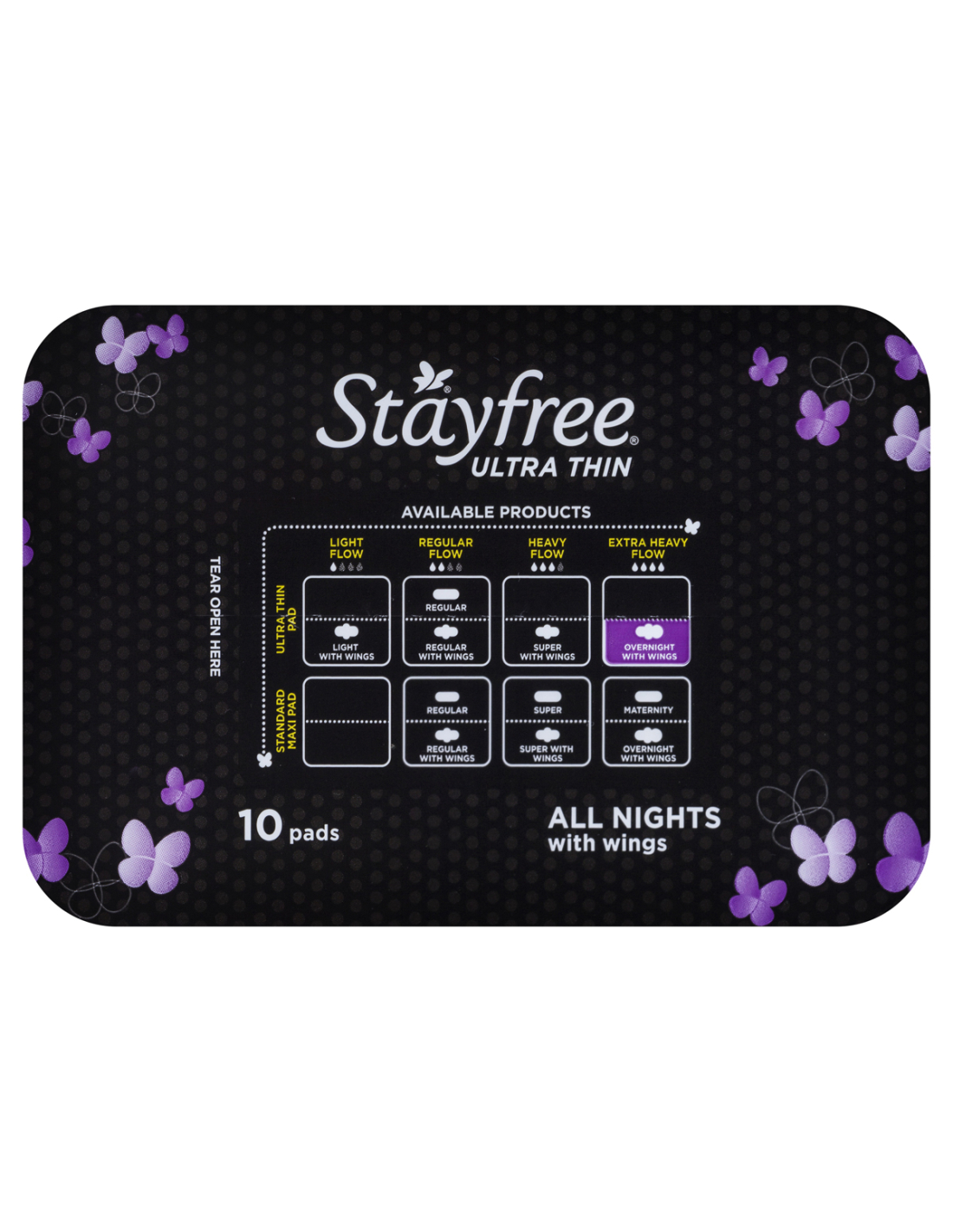 Stayfree está diseñado para PerfectFit, inspirado en la ropa deportiva (las almohadillas Stayfree no están hechas del mismo material que la ropa deportiva), para nuestra mejor protección contra fugas (vs Stayfree actual).Específicamente diseñado para seguir de cerca los movimientos de su cuerpo mientras duerme, con longitud y ancho adicionales en la parte posterior del panel (vs Current Stayfree), All Nights brinda una protección superior para ayudarlo a dormir mejor (vsStayfree Day Pads) sabiendo que las alas mantienen el pad en su lugar.