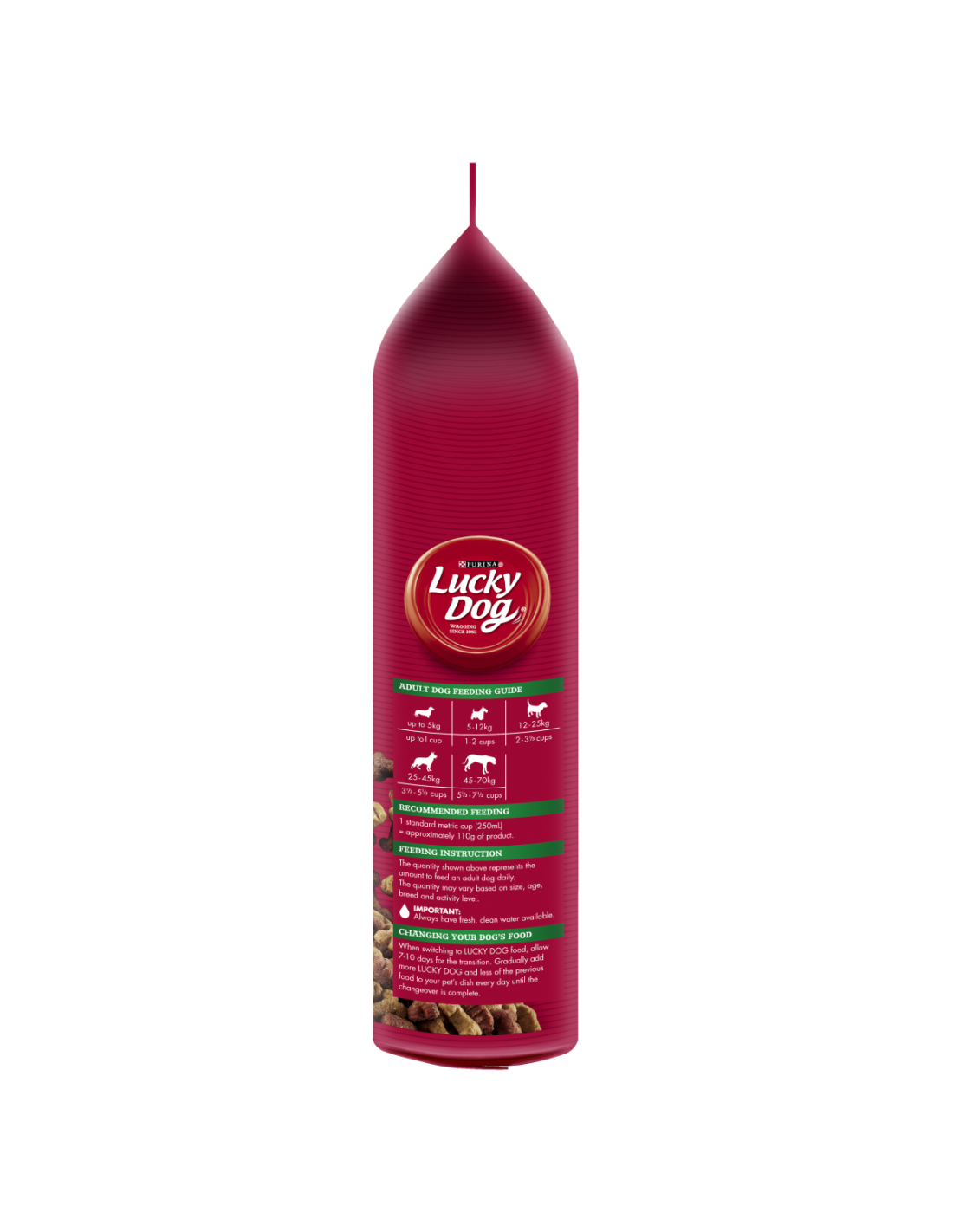 La queue de votre meilleur ami remuera pendant les repas avec la nourriture sèche pour chiens adultes PURINA® LUCKY DOG® à saveur de bœuf haché, de légumes et d'os à moelle. Ils adoreront certainement la véritable saveur de viande de chaque bouchée délicieusement croustillante et remplie de bienfaits nourrissants pour les maintenir en bonne santé et en bien-être. Cette nourriture pour chiens est fabriquée en Australie et contient 23 vitamines et minéraux essentiels, dont des oméga 6, pour garder leur pelage brillant et leur peau saine. Gardez votre animal en pleine forme avec de délicieux repas de PURINA® LUCKY DOG® tous les jours.