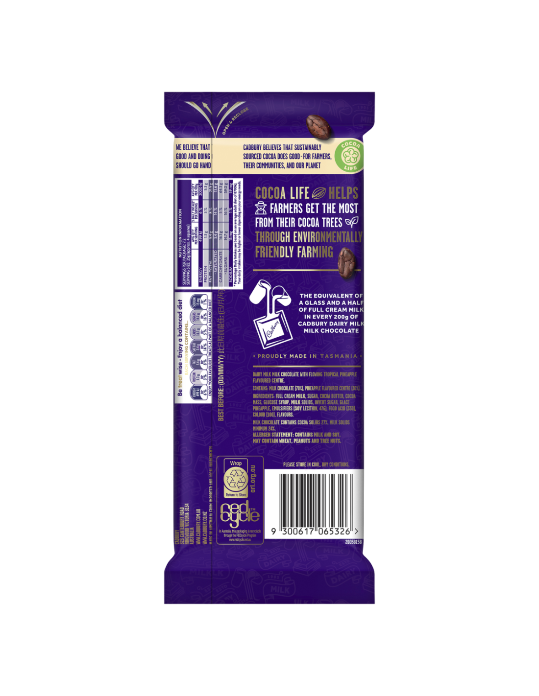 The equivalent of a glass and a half of full cream milk in every 200g of Cadbury Dairy Milk Milk Chocolate. Proudly made in Tasmania.