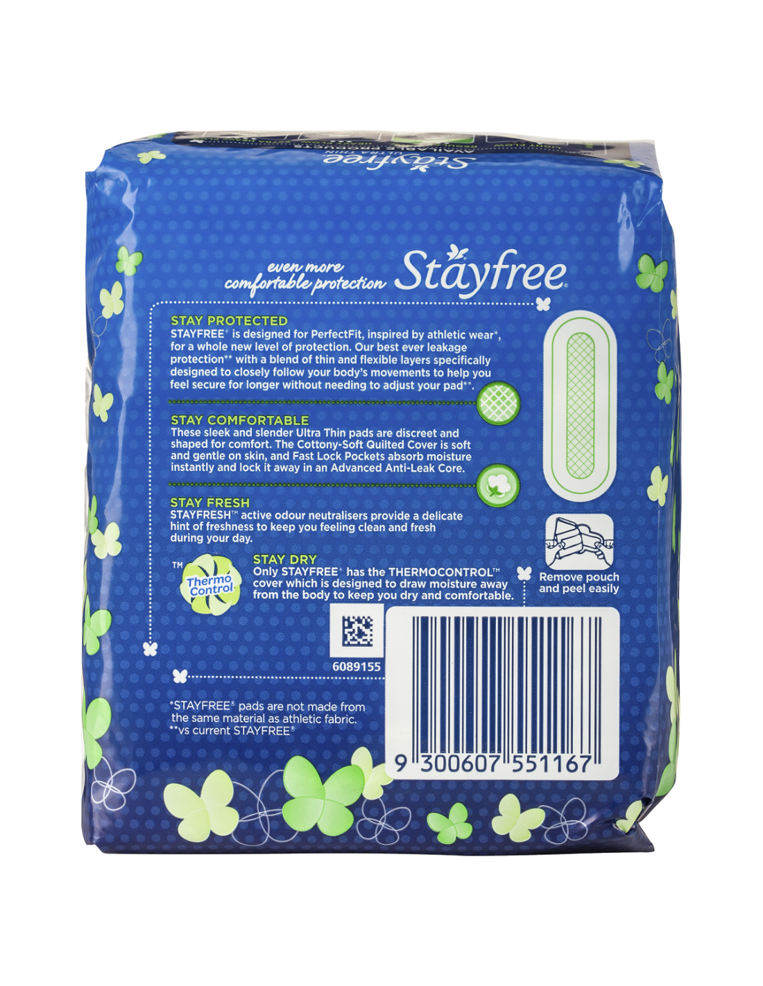 Stayfree is designed for PerfectFit, inspired by athletic wear (Stayfree pads are not made from the same material as athletic fabric), for a whole new level of protection. Our best ever leakage protection (vs current Stayfree) with a blend of thin and flexible layers specifically designed to closely follow your body's movements to help you feel secure for longer without needing to adjust your pad (vs current Stayfree).