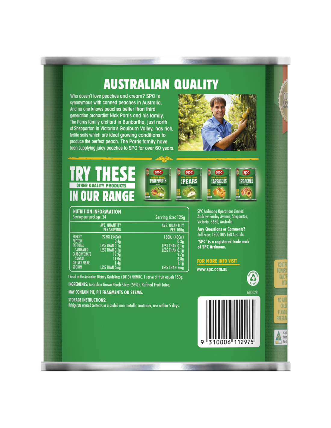 Chi non ama le pesche e la crema? SPC è sinonimo di pesca in scatola in Australia. E nessuno conosce pesche meglio del frutteto di terza generazione Nick Parris e la sua famiglia. Il frutteto di famiglia Parris a Bunbartha, a nord di Shepparton, nel Victoria's Goulburn Valley, ha terreni ricchi e fertili che sono condizioni di coltivazione ideali per produrre la pesca perfetta. La famiglia Parris fornisce pesche succose a SPC da oltre 60 anni.