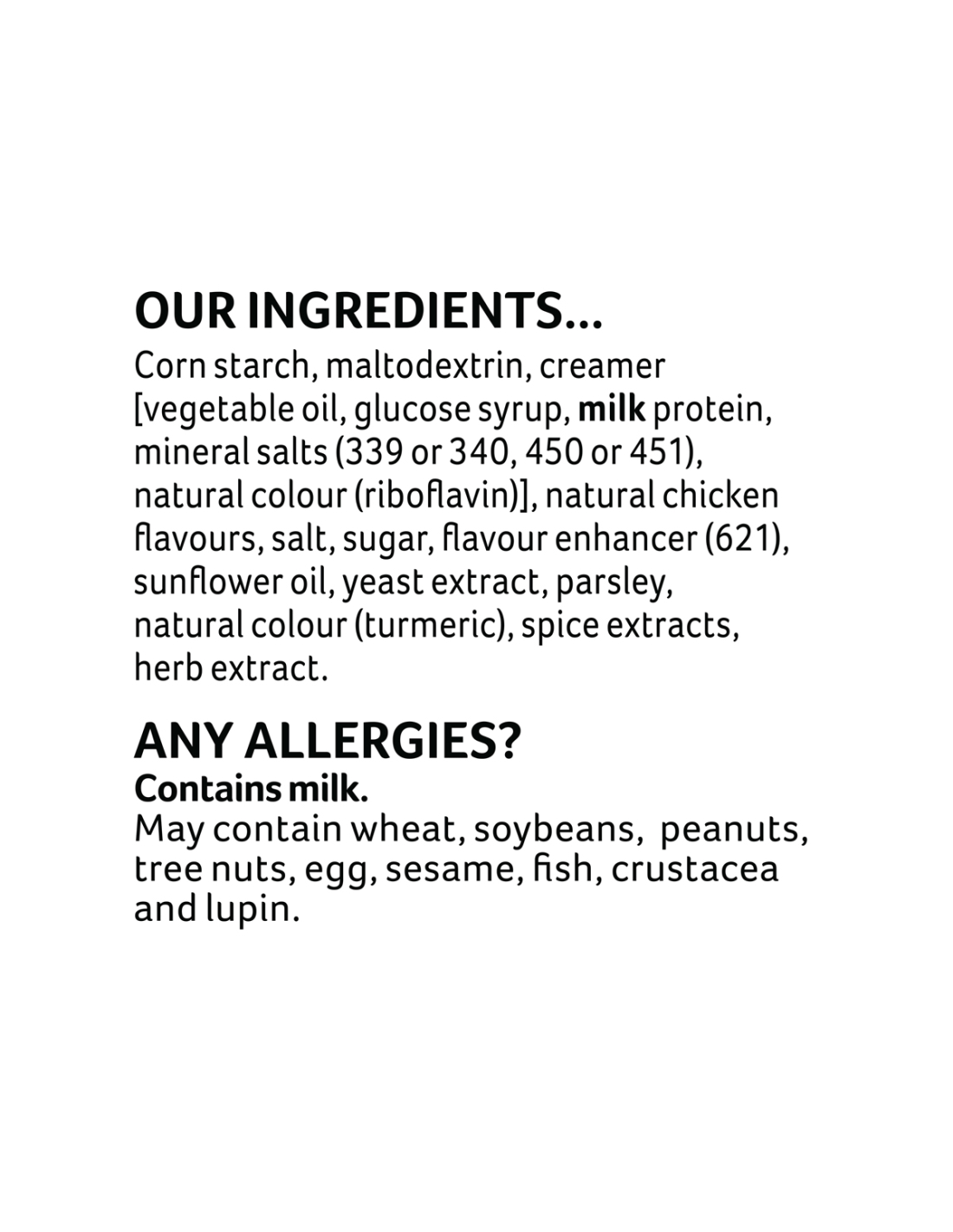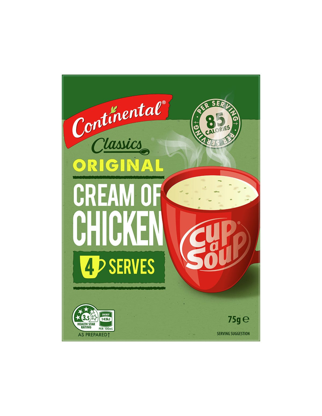 In Continental creiamo questa zuppa combinando verdure, erbe e spezie essiccate di alta qualità per garantire un'ottima zuppa di degustazione ogni volta: 1) Contenuto vuoto di una bustina in una tazza da 250 ml 2) riempire con acqua bollente e mescolare continuamente per 15-20 Secondi importanti: per garantire una consistenza liscia, non iniziare a mescolare la zuppa fino a quando tutta l'acqua non è stata versata nella tazza Continental ha fatto parte delle case australiane dagli anni '50, quando abbiamo lanciato per la prima volta la nostra iconica zuppa di noodle di pollo da allora, abbiamo Ho costantemente consegnato australiani le zuppe che conoscono e adorano i nostri prodotti continentali sono realizzati con ingredienti attentamente selezionati tutte le nostre verdure, erbe e spezie vengono coltivate sul campo, maturate al sole e raccolte in stagione - quando hanno il loro meglio per il prossimo, Questi ingredienti sono essiccati, che è il modo più antico noto per preservare il cibo a Continental, ci siamo sempre strappati sulla qualità di ciò che produciamo, dall'approvvigionamento del miglior qu Gli ingredienti di alità a mettere chef appassionati e di talento nelle nostre cucine questa classica crema di zuppa di pollo è priva di colori artificiali e sapori artificiali scoprono di più a Continental Com Au e ContinentalFoods Co NZ seguici su Facebook a ContinentalCupasoupupupuPoupup
