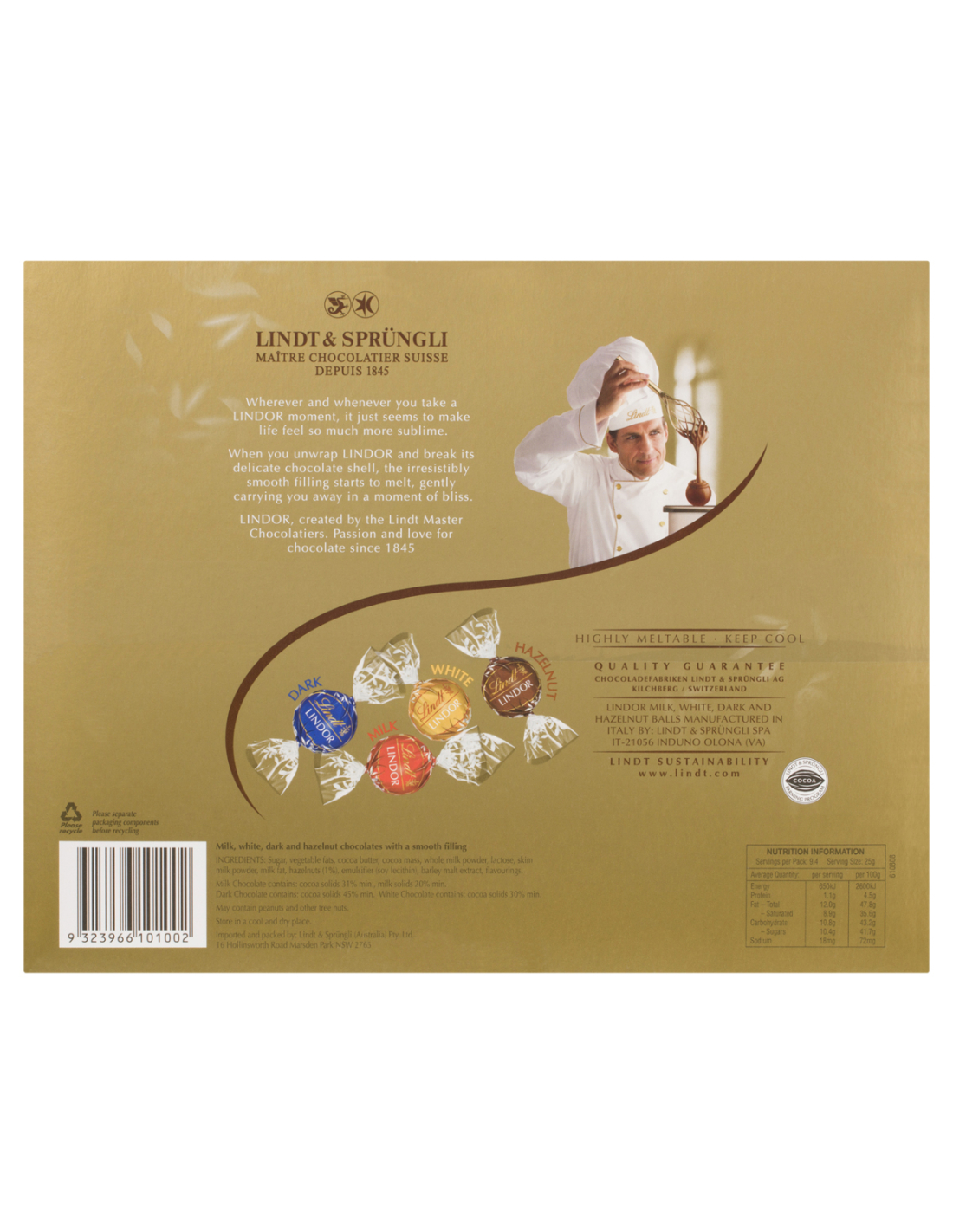 Lindorとの至福の至福の贈り物を、繊細なチョコレートシェルと繊細なチョコレートのシェルと黒人のチョコレートの品揃え、そして、リンドットのマスターショコラティエによって作られた魅力的な滑らかな充填充填、あらゆる機会に完璧な贈り物を作りました。