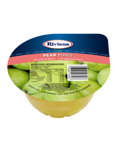 Peren gepureerd tot een gladde, klontvrije textuur, vervolgens verpakt in een doorzichtig plastic bakje zodat het gepureerde fruit zichtbaar zichtbaar is