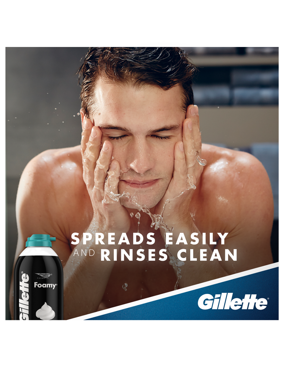 De licht geparfumeerde voor gevoelige huid schuim verspreidt zich gemakkelijk en spoelt schoon voor dat schuimige scheren mannen hebben genoten voor generaties. Met de Gillette Comfort Glidformule.