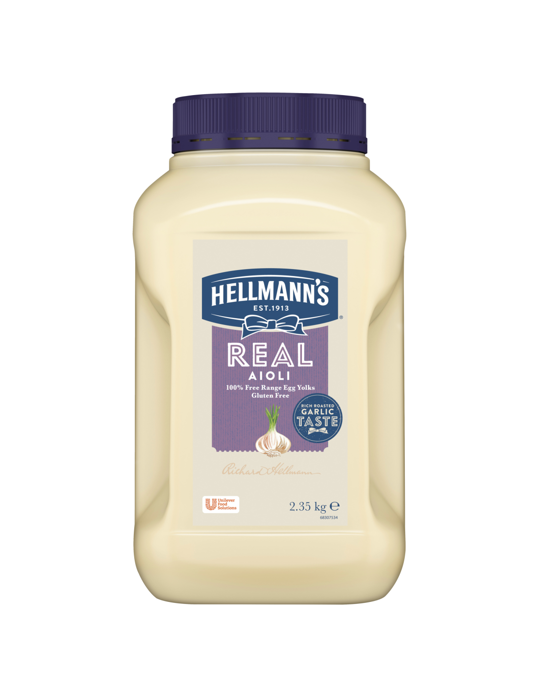 Hellmann's REAL Aioli is made to an authentic recipe using 100% free range egg yolks with an infusion of garlic for that real scratch made aioli taste. It is perfectly balanced and delivers a consistent , real garlic flavour every time. Perfect for all applications across the professional kitchen including dipping, spreading, binding and coating. Hellmann's Real Aioli is gluten free, halal certified, has no artificial colours or flavours, and has no added MSG, making it the 'go to' premium aioli for savvy chefs in commercial kitchens of all sizes.