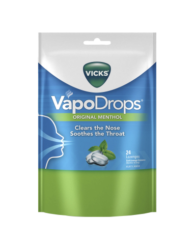 Vicks VapoDrops szybko złagodzi “ łaskotanie gardła  poprzedzające atak kaszlu i może uniemożliwić ci używanie głosu z ufnością! Pasteczki pomogą uspokoić gardło i oczyścić nos. Poczuj efekt w kilka sekund!