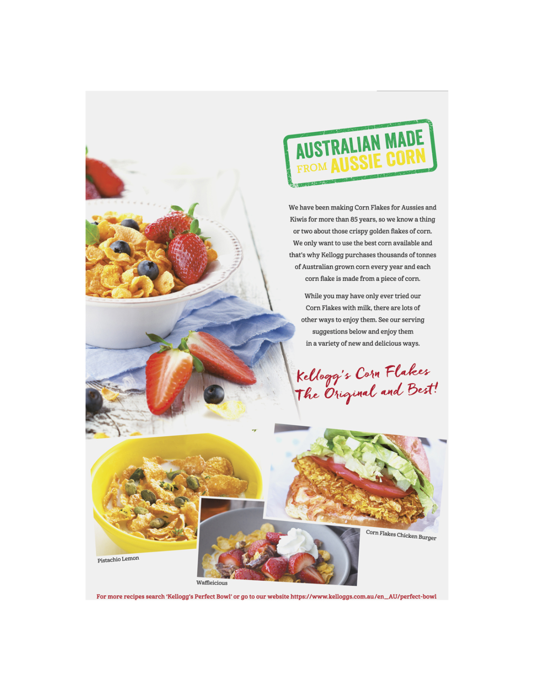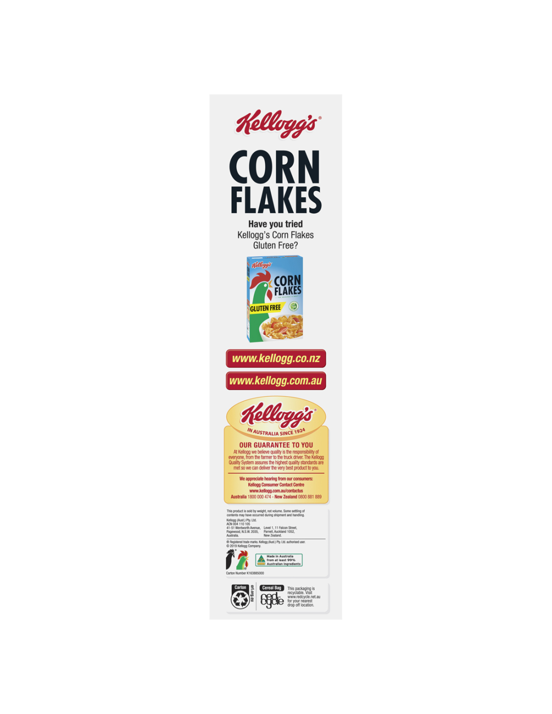 Kellogg'To oryginał Kellogg'to płatki śniadaniowe. W Australii i Nowej Zelandii jest to jedna z pierwszych marek, o których większość ludzi myśli, gdy myśli o płatkach śniadaniowych. Płatki kukurydziane to chrupkie, lekkie płatki dojrzałej kukurydzy, które nie tylko smakują dobrze, ale dają zdrowy początek dnia!