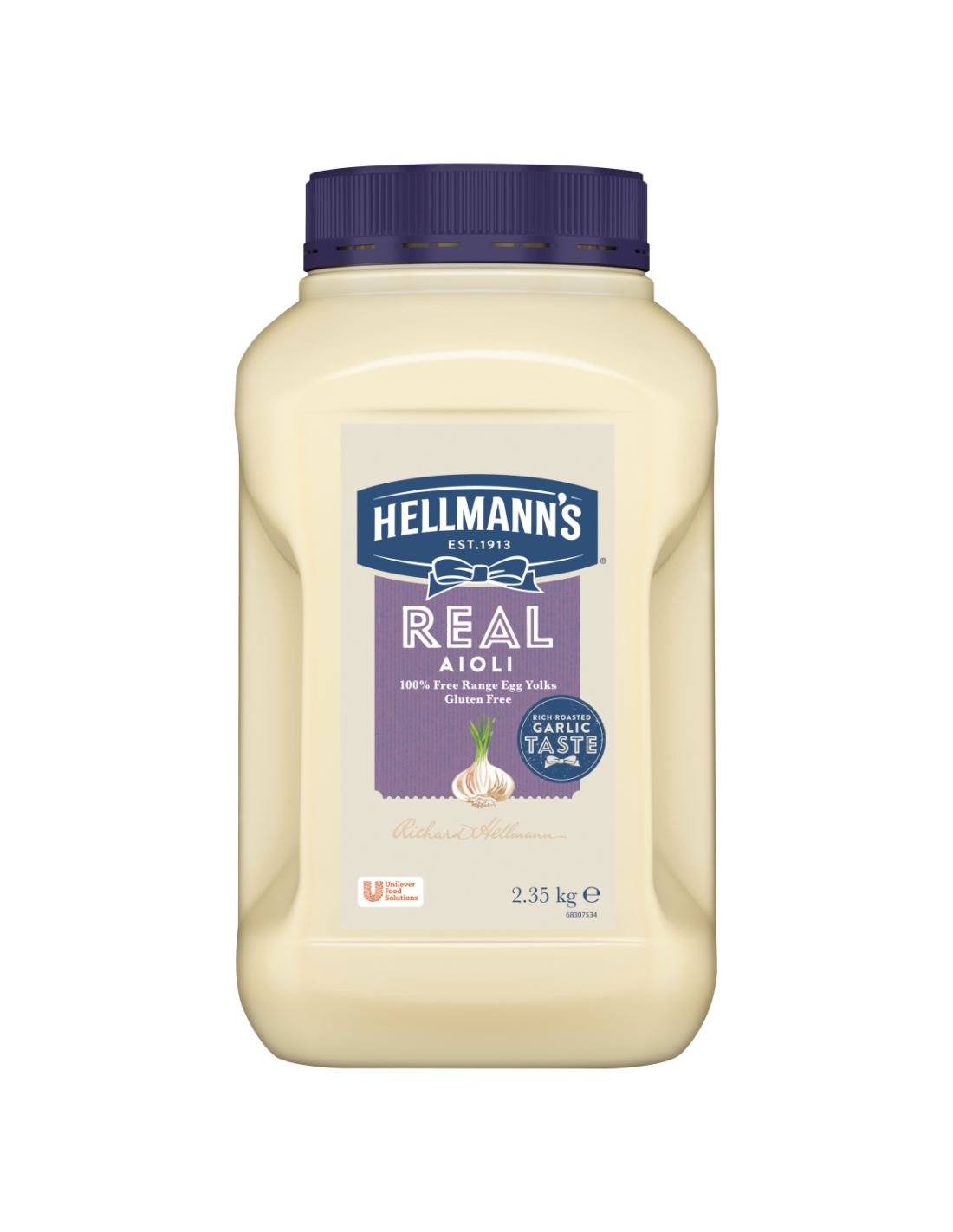 Hellmann'真正的Aioli是用100%的自由射程蛋黄 加上大蒜的灌注 制成的正宗配方. 它完全平衡 每一次都会发出一成不变的 真正的大蒜味. 适合整个专业厨房的所有应用,包括水滴、散射、捆绑和涂层。. Hellmann'真正的艾奥利是免费的, 卤质认证, 没有人工的颜色或香味, 没有添加的MSG.