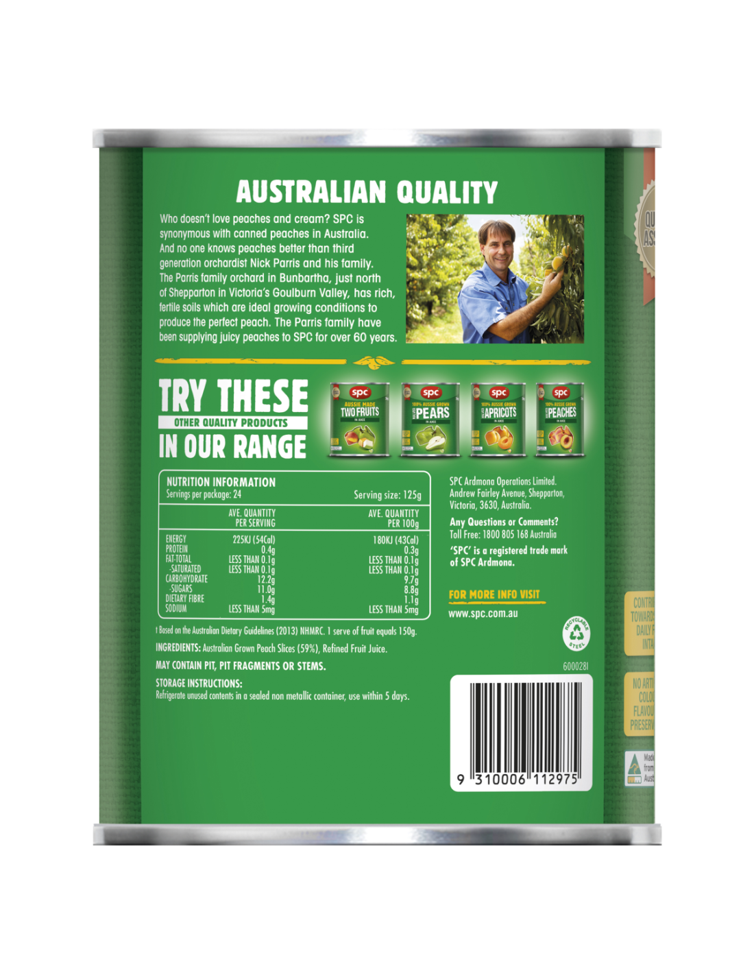 SPC 100%Aussie在果汁中生长了切片桃3kg - 产品由新鲜的桃子组成,可剥离和切片。 检查水果并填充到A10罐中,该罐子用浅汁。 进行密封和热处理,以确保最佳的密封完整性,产品质量和微生物稳定性。