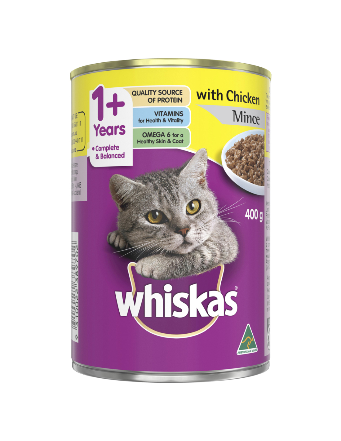 WHISKAS罐装猫粮可为成年猫提供完整的饮食,并符合美国饲料控制官员协会(AAFCO)为成年猫提供的营养水平。