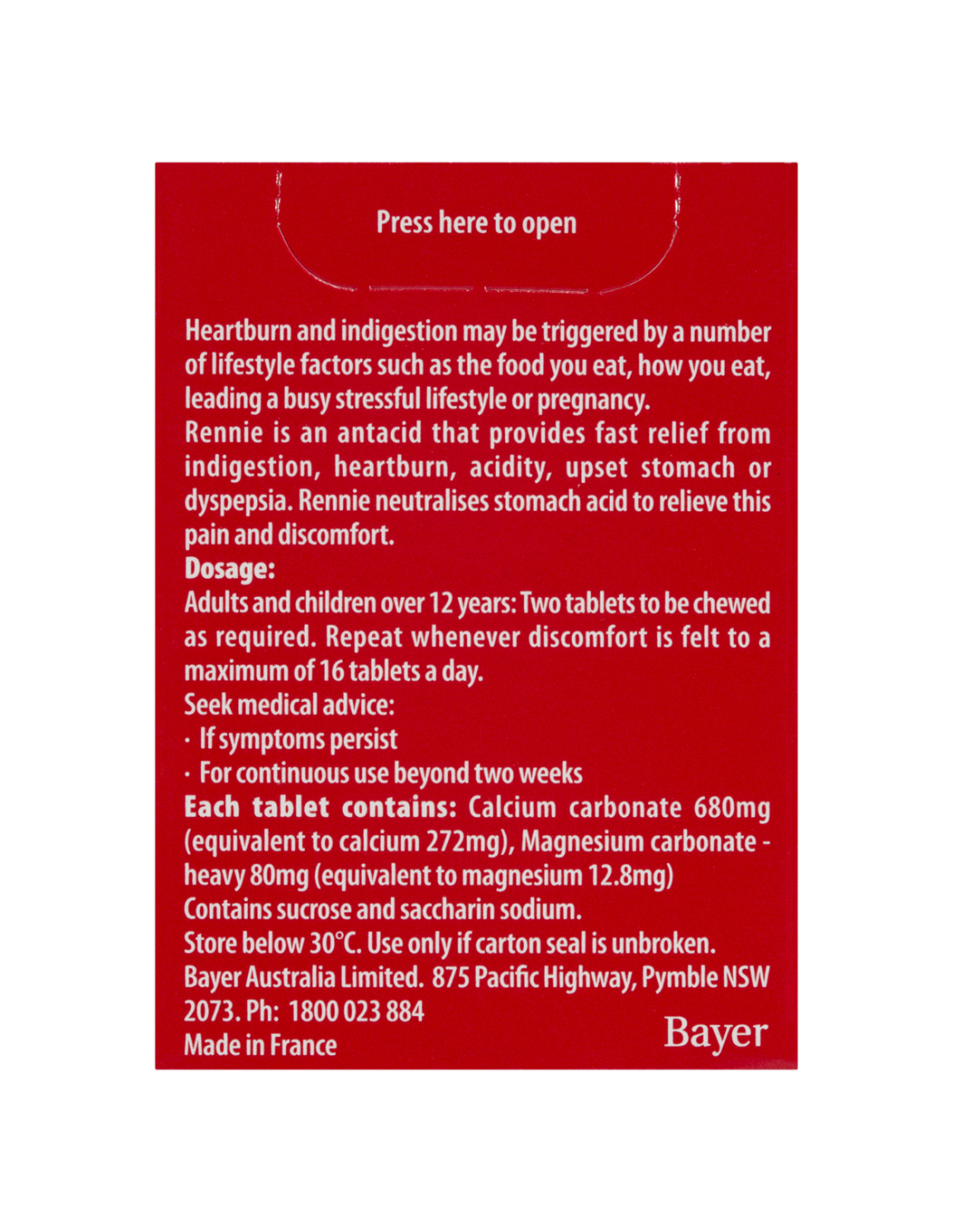 rennie是一种抗酸,可从消化不良,胃灼热,酸度,胃癌或消化不良中和胃酸中提供快速缓解,以缓解疼痛和不适 - 从消化不良胃灼热,酸度,酸度释放